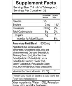The product is a highly-concentrated, energizing whole fruit puree blend that is rich in Anti-Oxidants and naturally-occurring vitamins and minerals. It comes in the 2 oz and 8 oz options.
